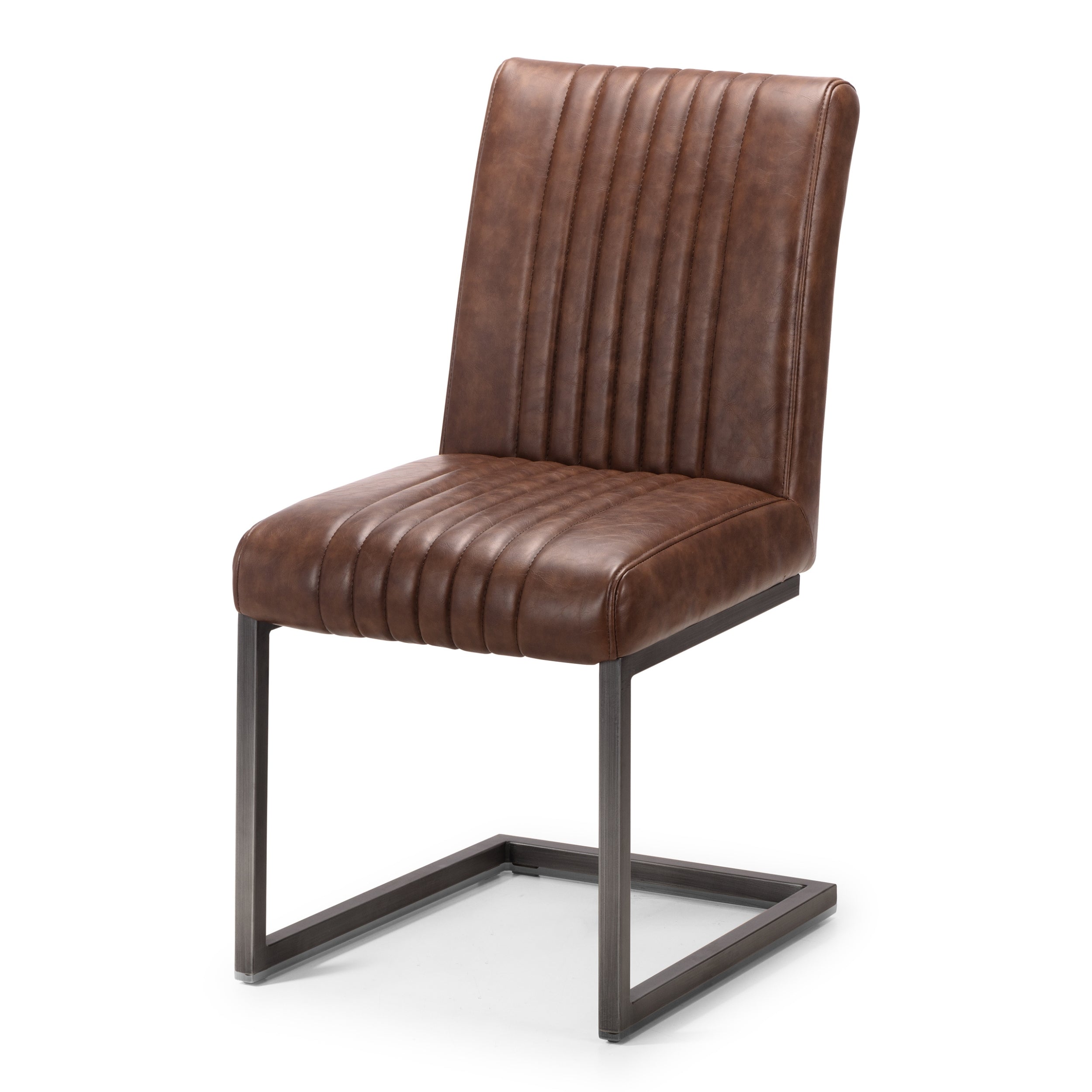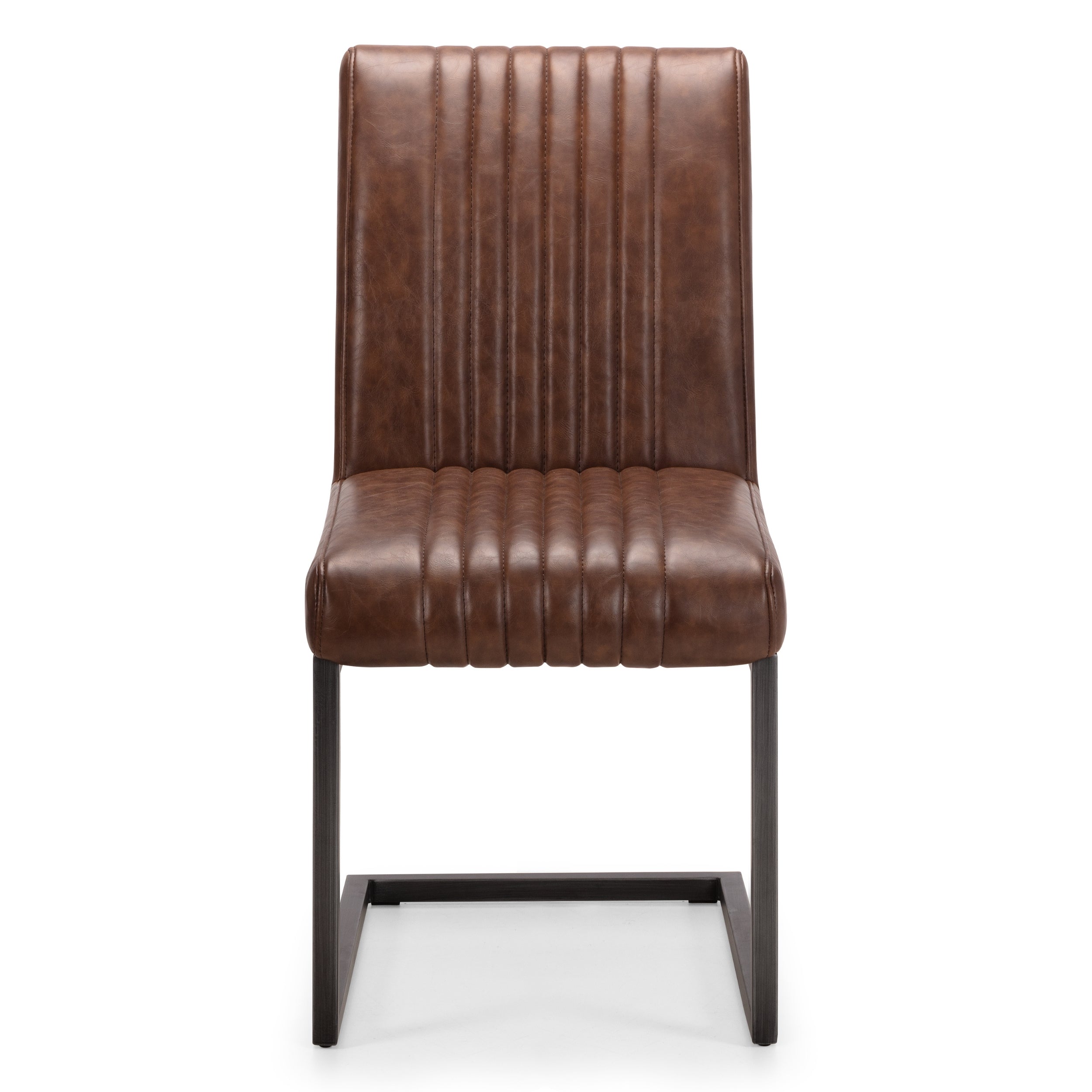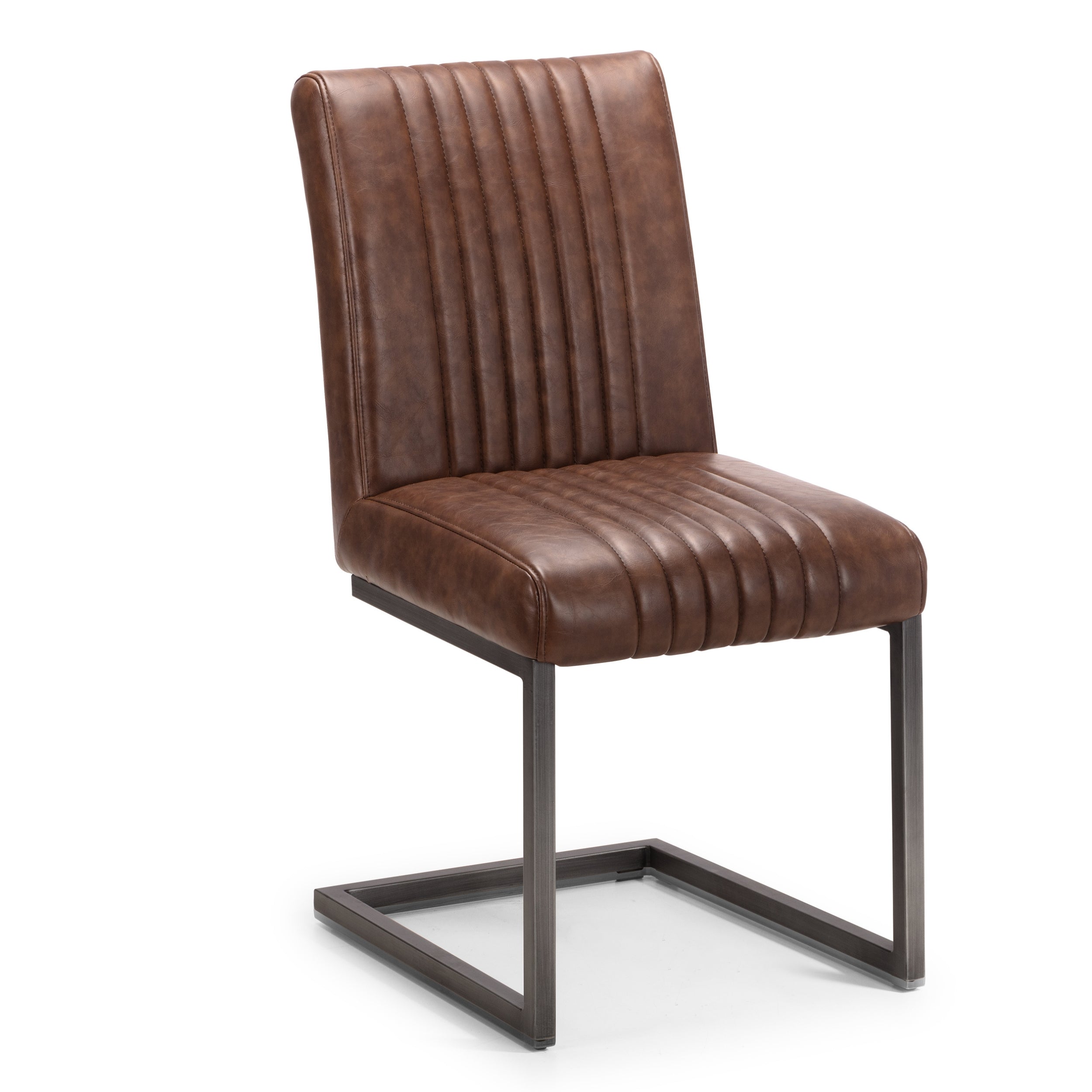 The Brooklyn Dining Chair has an industrial, retro design in a vintage brown faux leather finish with a cantilever style gunmetal leg frame. Offering maximum comfort and style. This padded chair can be used independently or beautifully accompanies vast rustic/ retro styled dining tables.