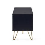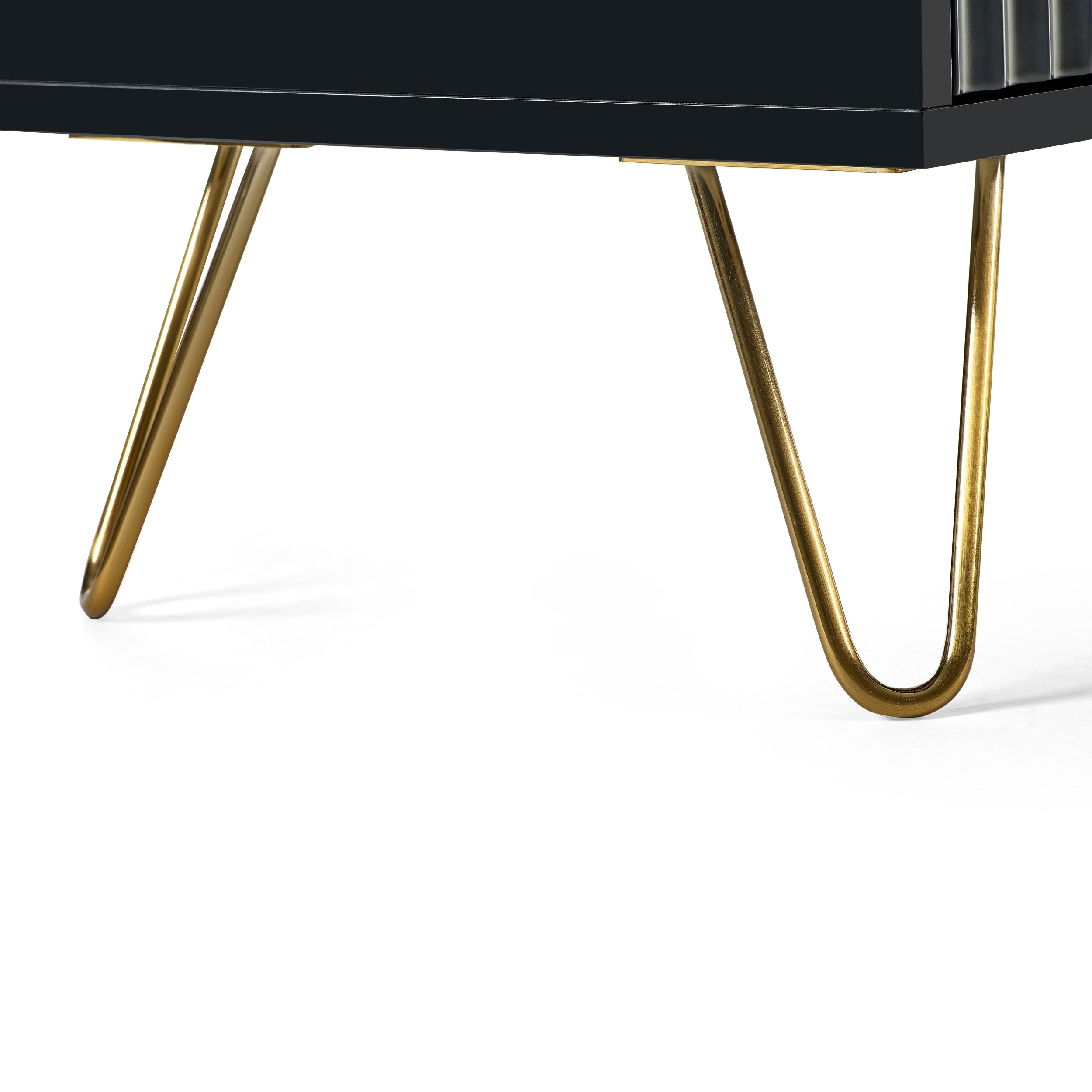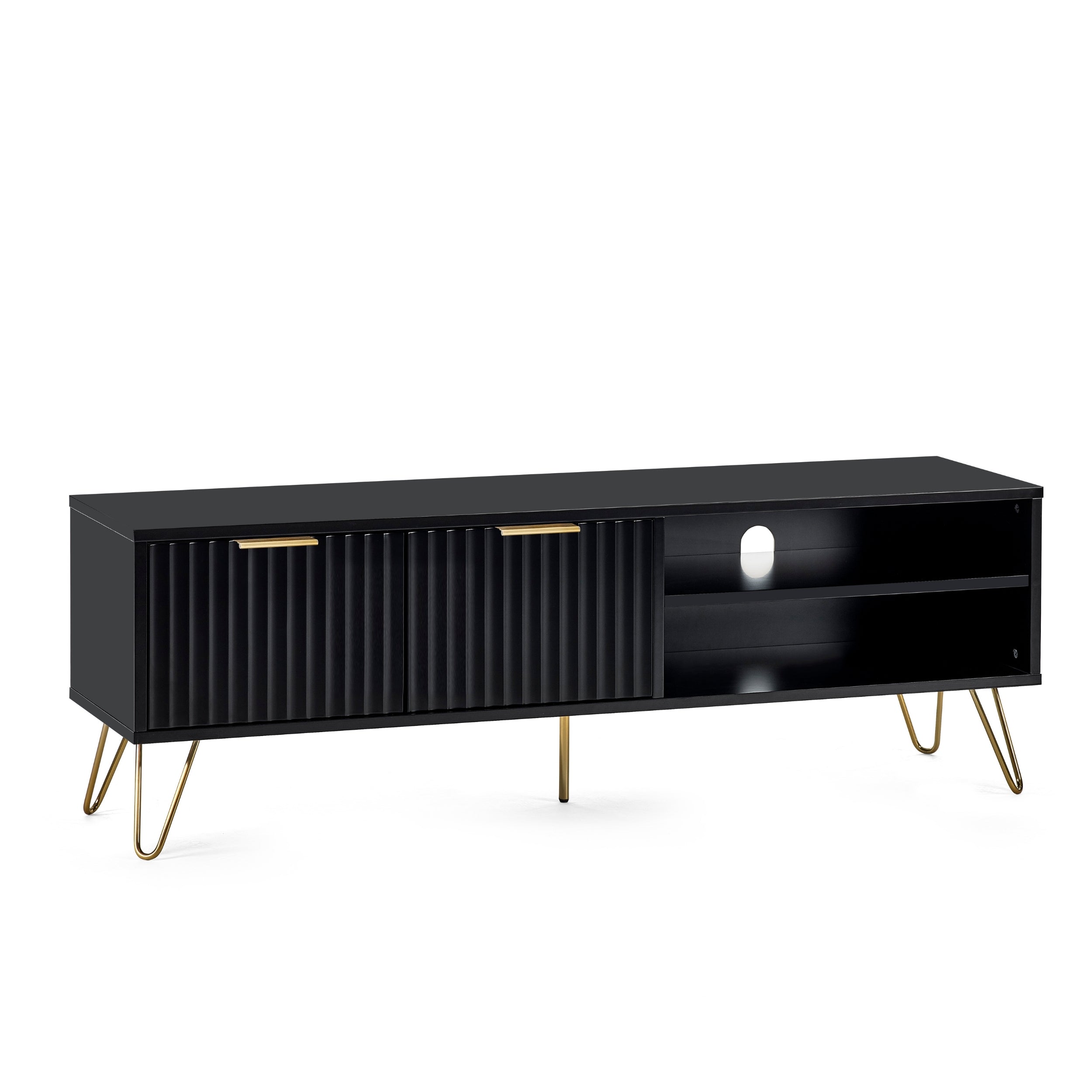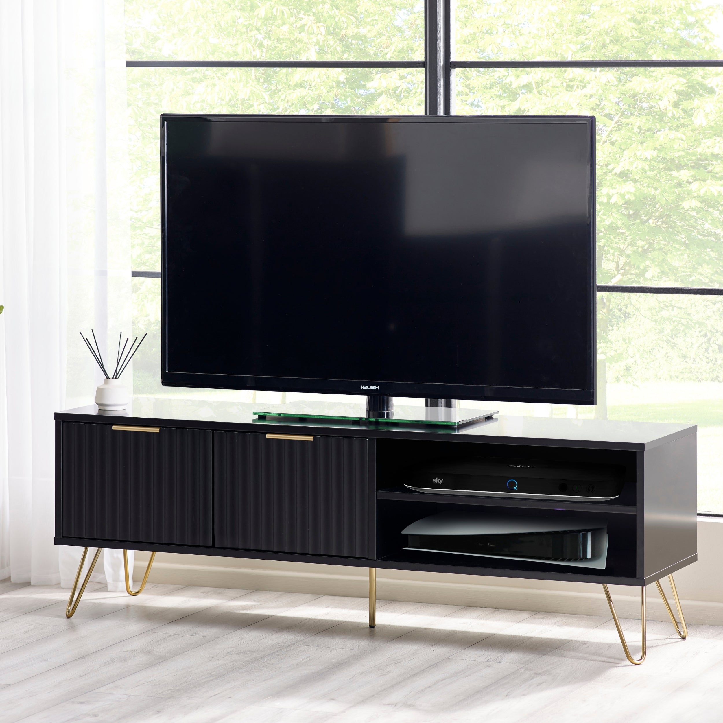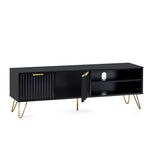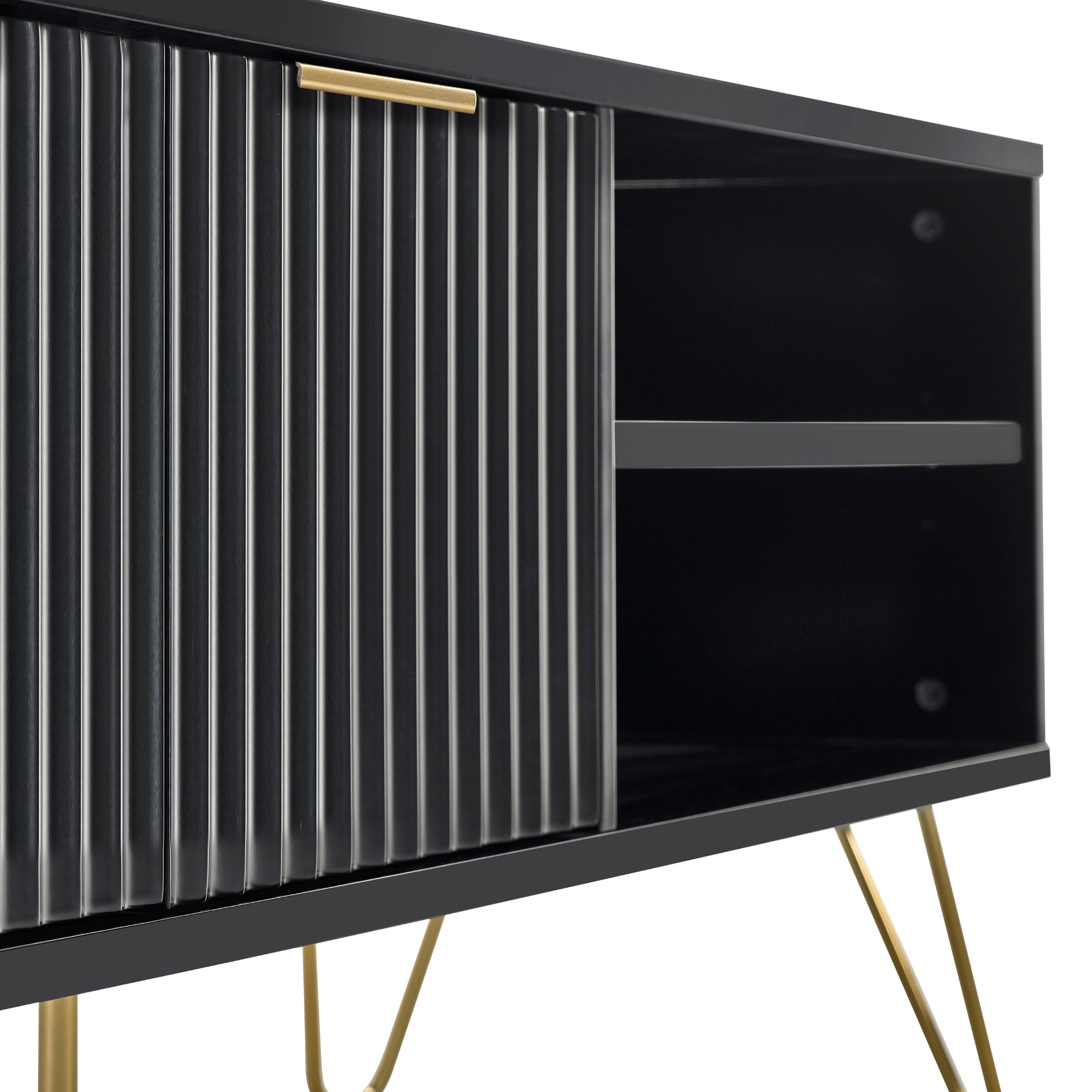 Discover the stunning sculpted fronts of the Murano TV unit in Matte Black & Gold Accents. With its sleek design and elegant brushed gold accents, this high-end piece is both on-trend and versatile for any interior style. Consider pairing with plush velvet furniture to elevate your home's aesthetic. This collection features black living room pieces for a complete and sophisticated look.