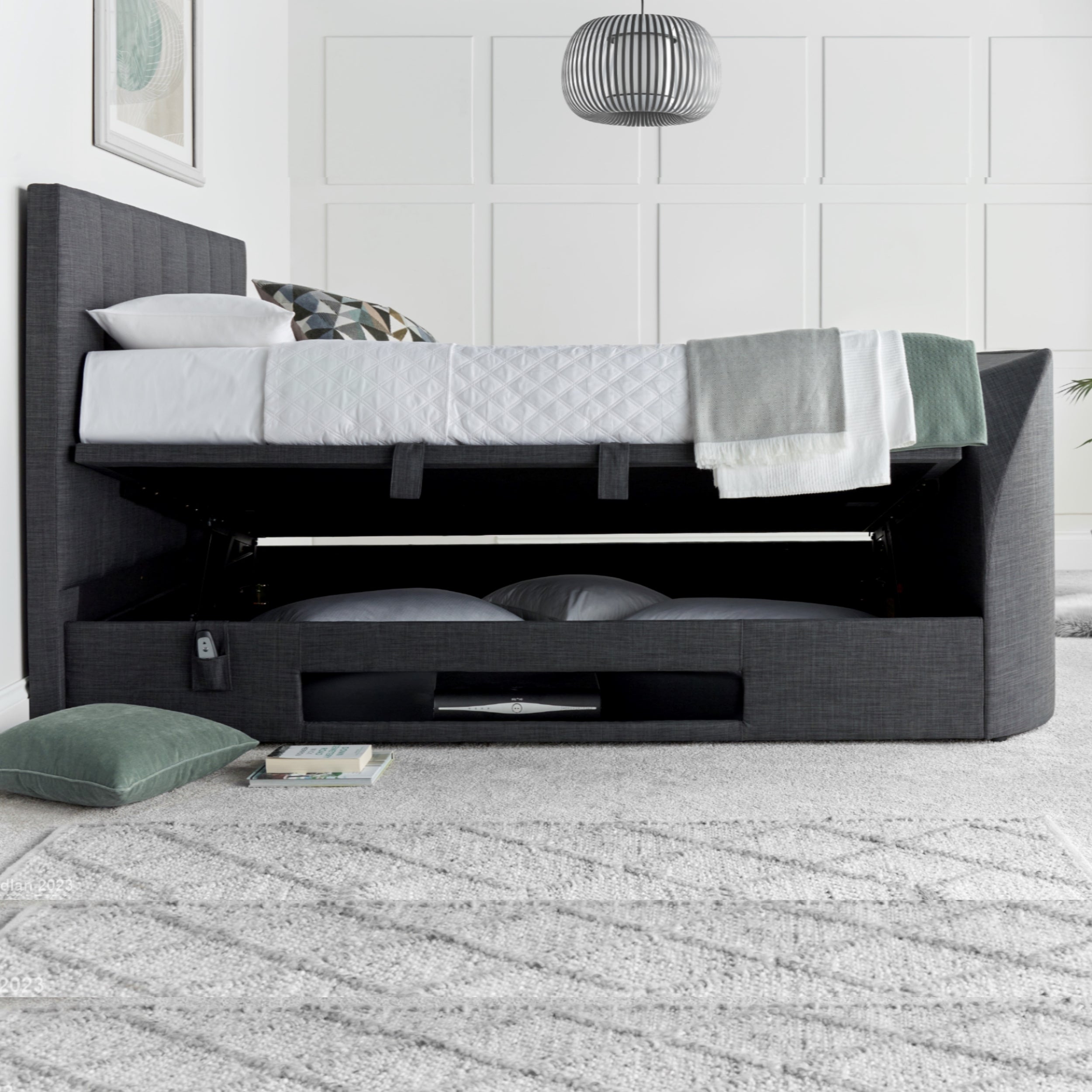 The Medburn / Medway TV bed has an elegant modern design head end with vertical padding for comfort and a spacious side-access ottoman storage area. The Medburn / Medway TV Bed can house TV screens of up to 43” within its ultra-slim foot end (size must be within the maximum dimensions). With its remote-control operation and convenient under-bed media storage shelf, the Medburn / Medway TV Bed frees up wall space and hides all cables to offer the comfort of a hotel stay – at home. Side access to a floating floor ottoman storage area (610-859 L) provides easy access to any items stored within.