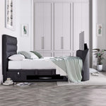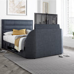The Kirkby / Kirkley TV bed has an elegant modern design slim border horizontal  stich padded head end with spacious side-access ottoman storage area. The Kirkby / Kirkley Bed can house TV screens of up to 43” within its ultra-slim foot end (size must be within the maximum dimensions). With its remote-control operation and convenient under-bed media storage shelf, the Kirkby / Kirkley Bed frees up wall space and hides all cables to offer the comfort of a hotel stay–at–home.